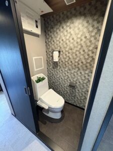 トイレ: 遊び心のあるヘキサゴン(六角形)柄のアクセントクロスがポイント。